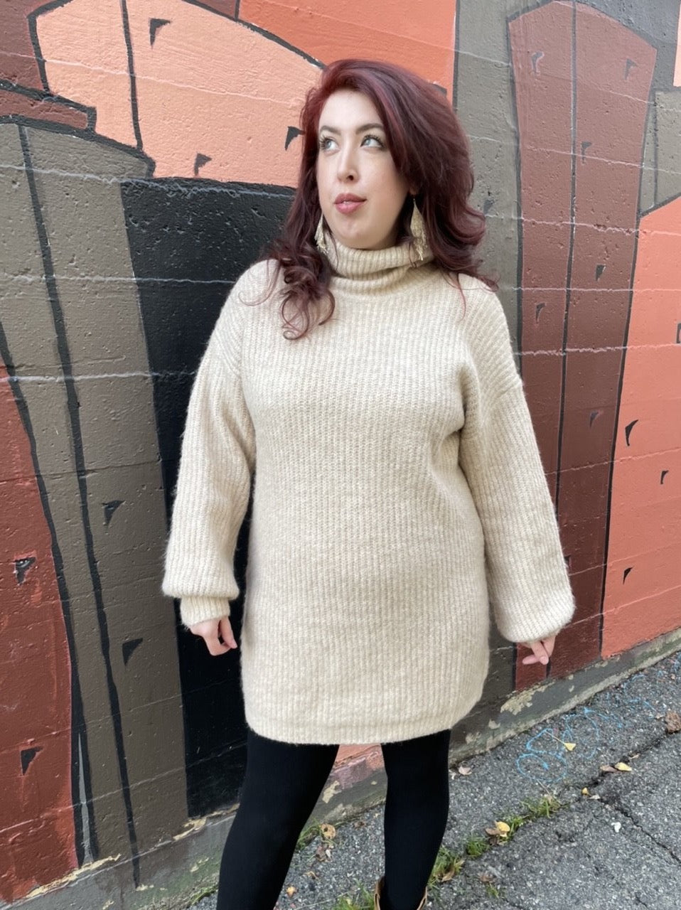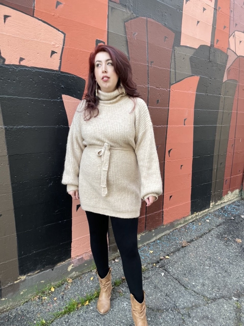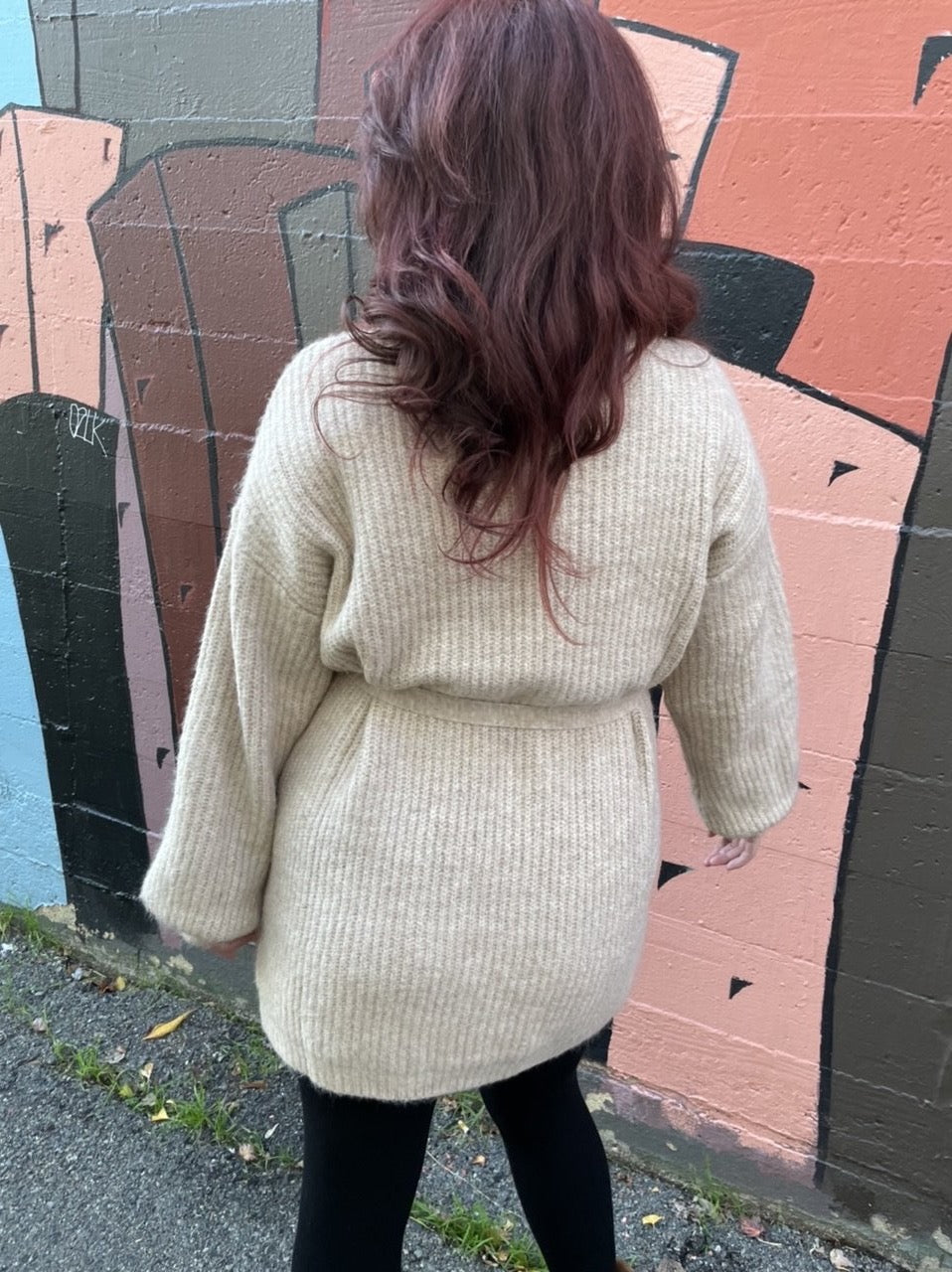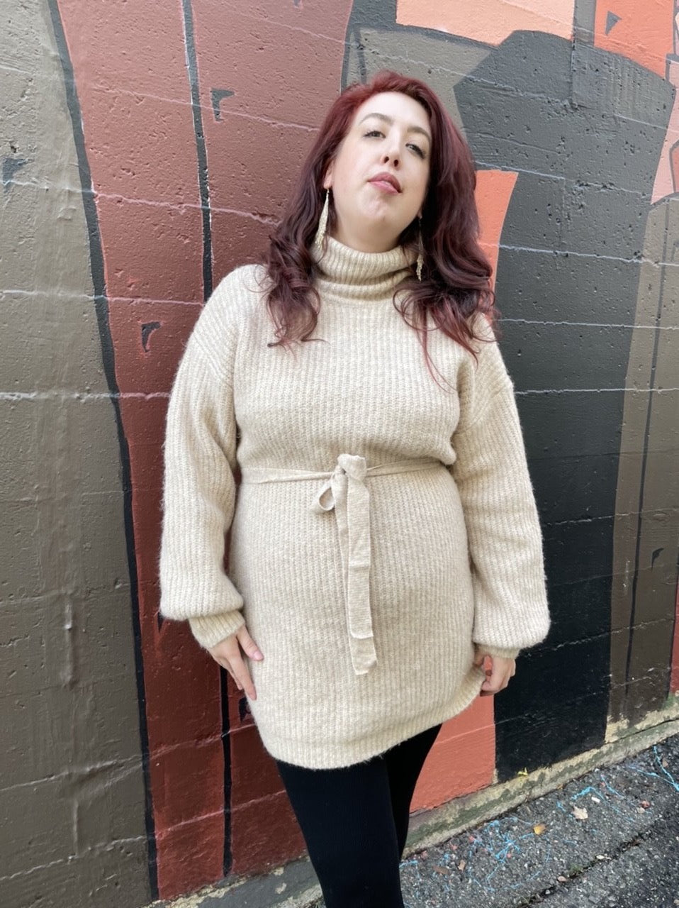This cozy sweater dress is has great style and detail. It features an adjustable waist tie, dropped shoulder, mini dress length with voluminous sleeve. The weight is substantial for a winters day. Acrylic blend. Wash cold, flat dry.