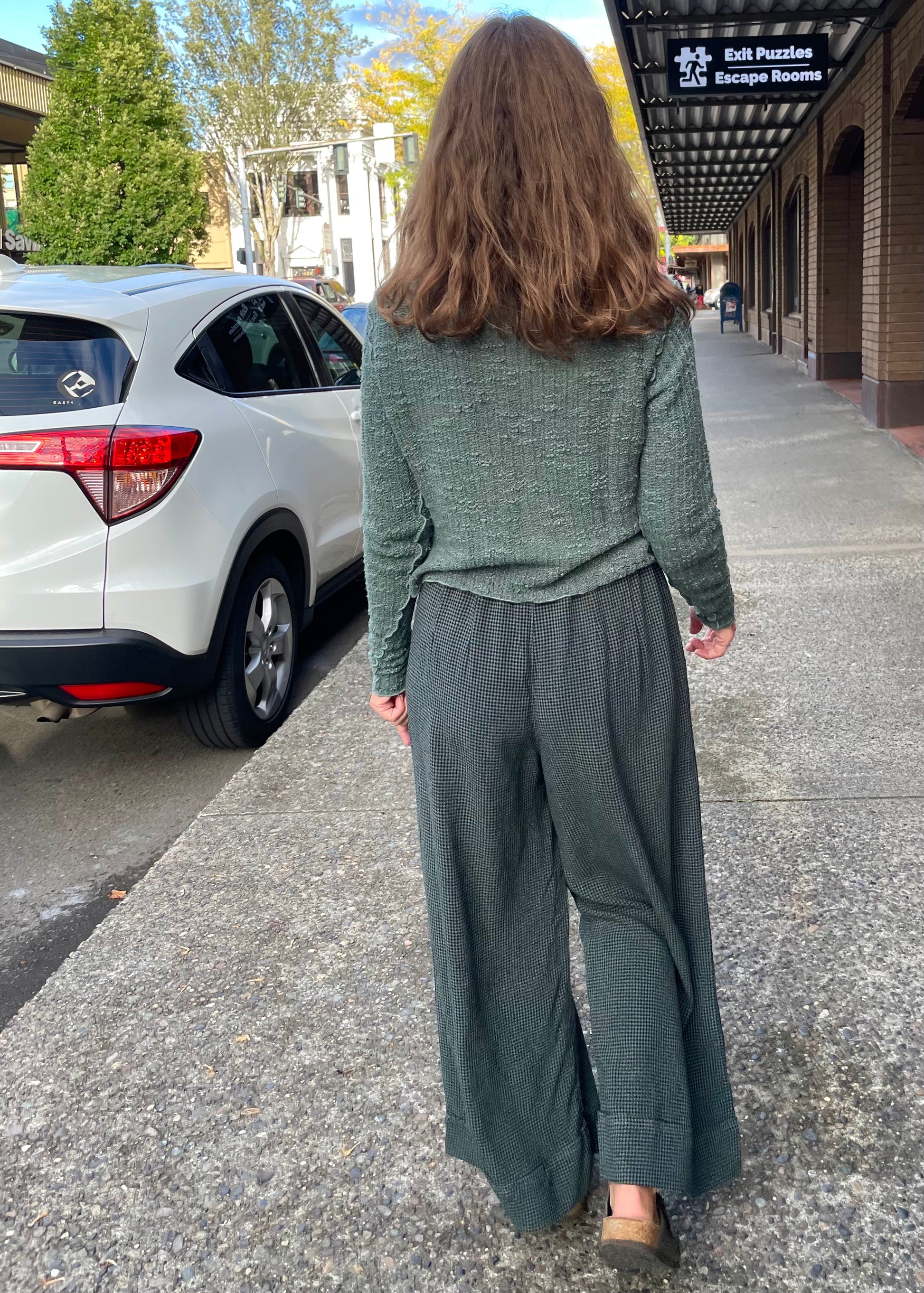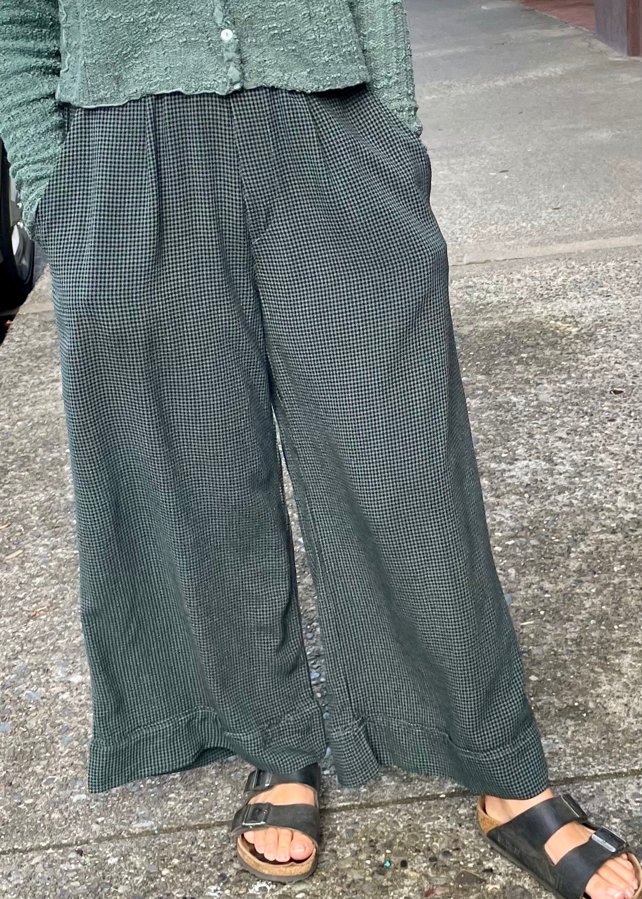 The Pleated Crop Pant is made in a soft and breathable Tencel with a sophisticated mini check pattern. Easily dressed up or down, it has an all-day comfortable elastic waistband accented with two front pleats and a full leg with a deep cuffed hemline. It finishes with a faux fly and two side pockets. This is the go-to pant essential for your transitional weather wardrobe.