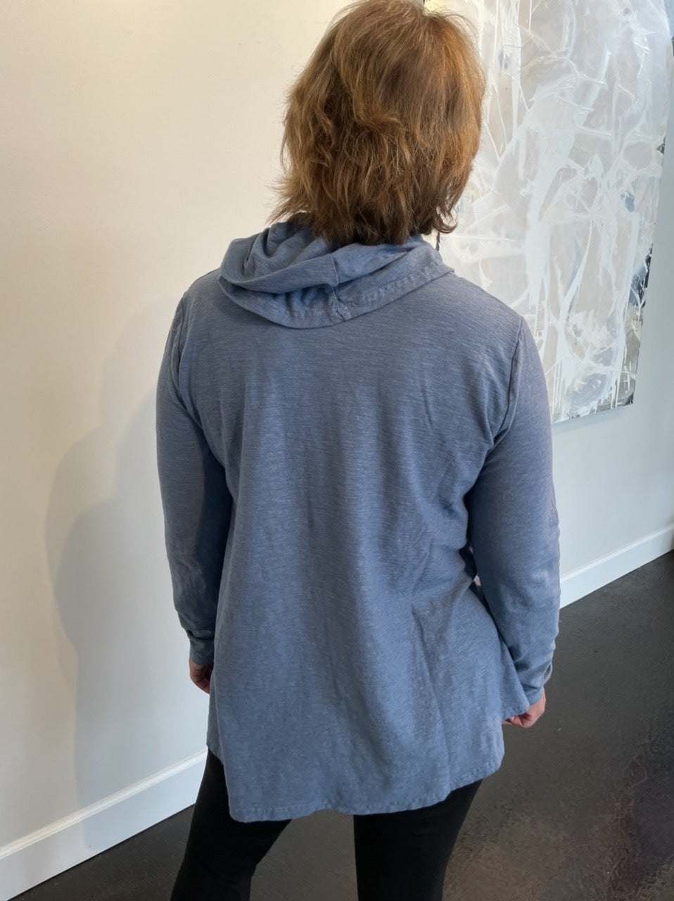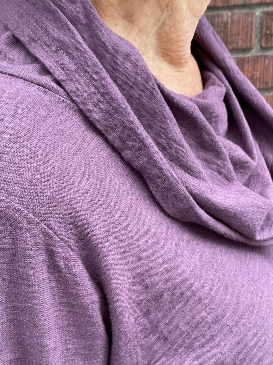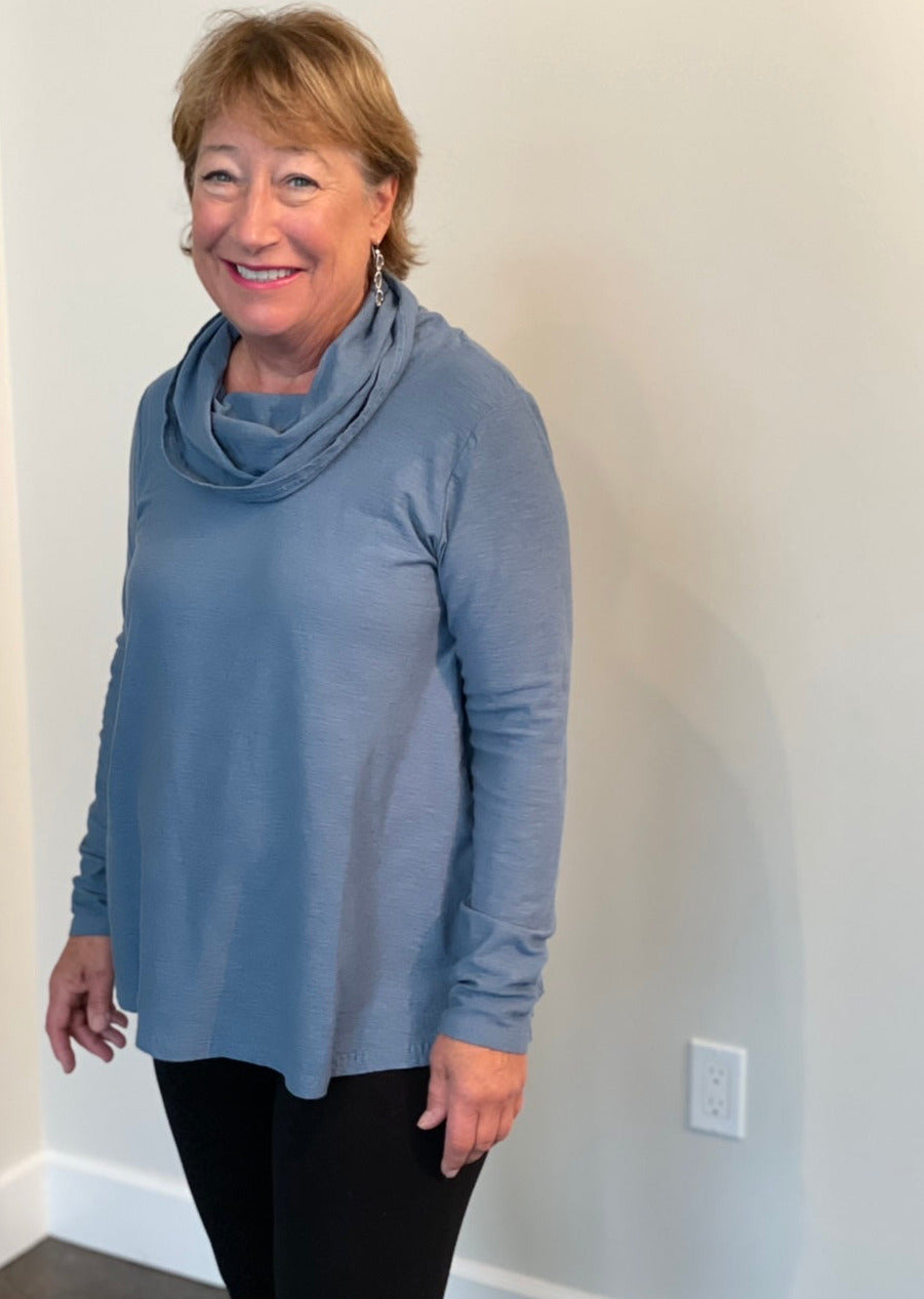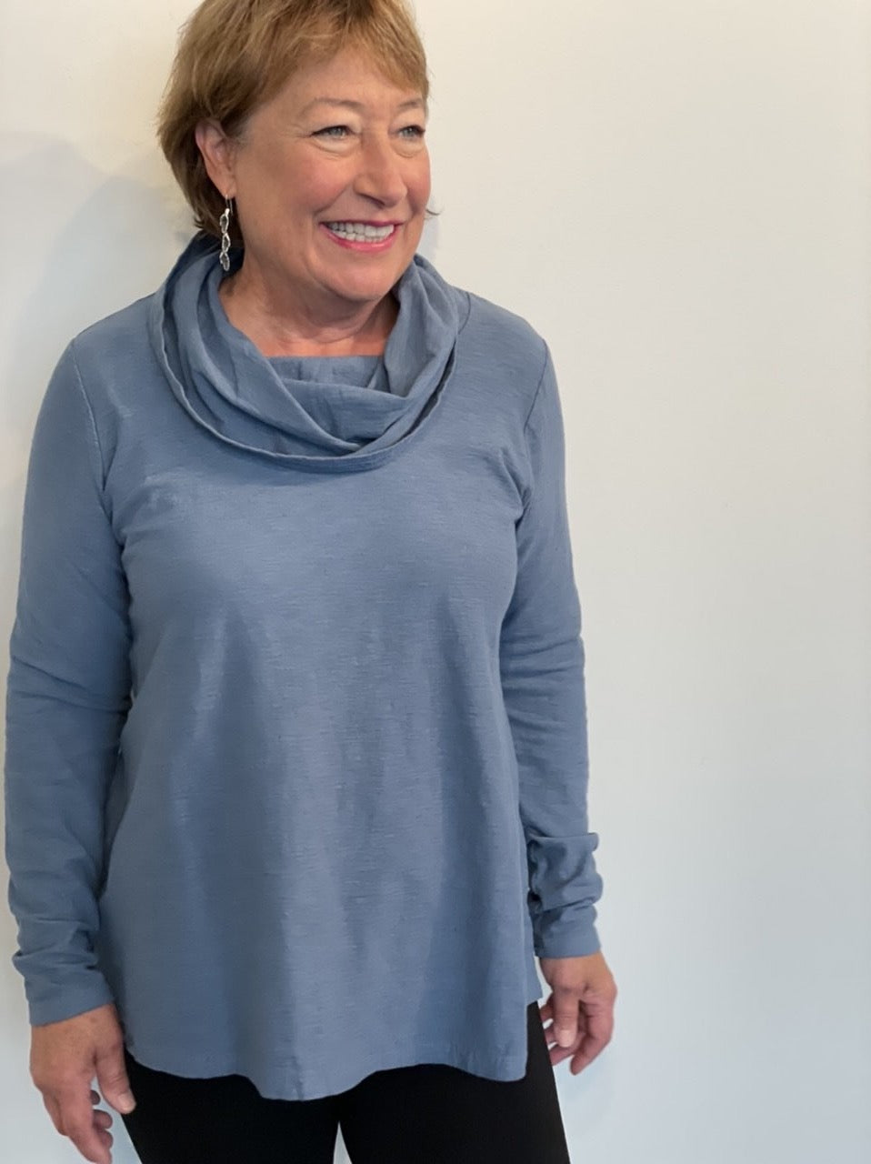 Simple enough with a little cozy attitude! This t-shirt style top features an exaggerated cowl neckline, loose swing style fit and long sleeves. Cotton/linen blend. Machine wash/dry.