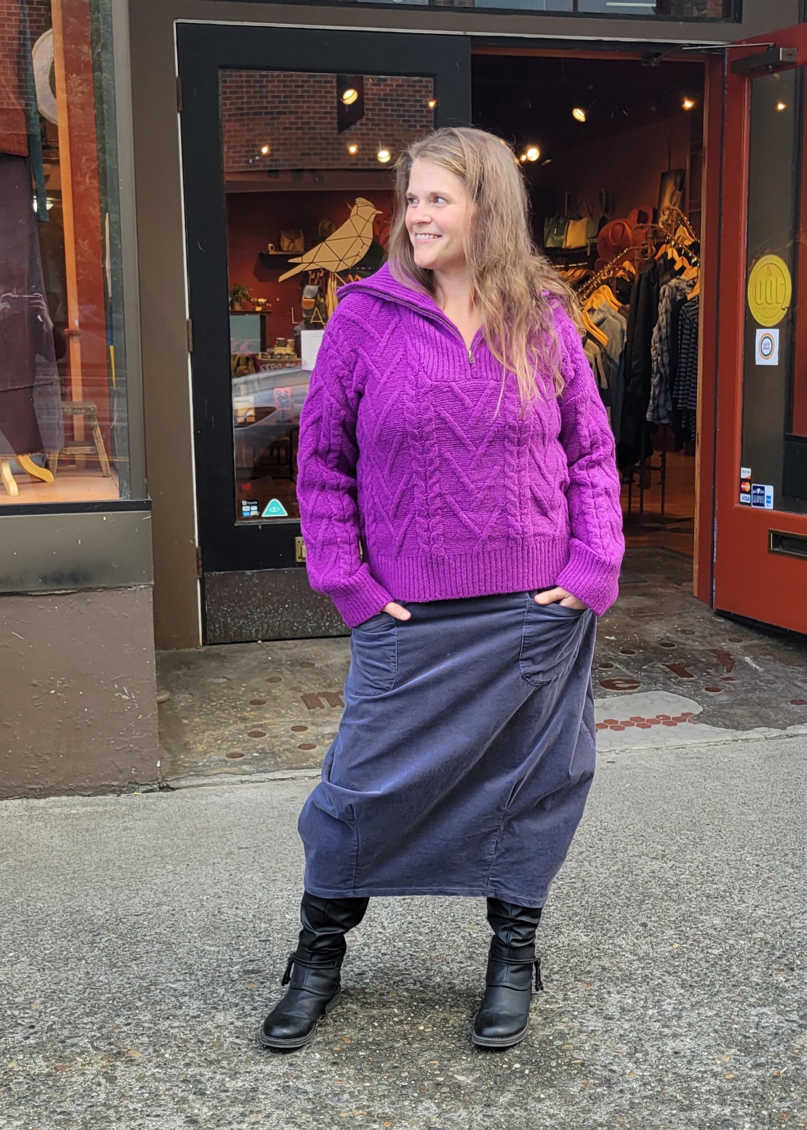 Thick and chunky! This bold fuschia sweater has a large cowl zip neckline and features a braided knit texture. It has long sleeves, and ribbed knitting at the cuff. Wear it with your favorite skirt or jeans. Warm and cozy all season long!