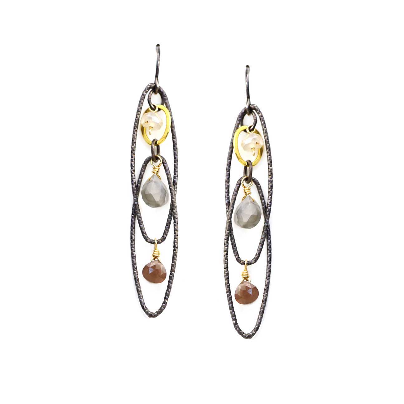 Long oval mobiles with grey and chocolate moonstone drops with little gold-filled accents.