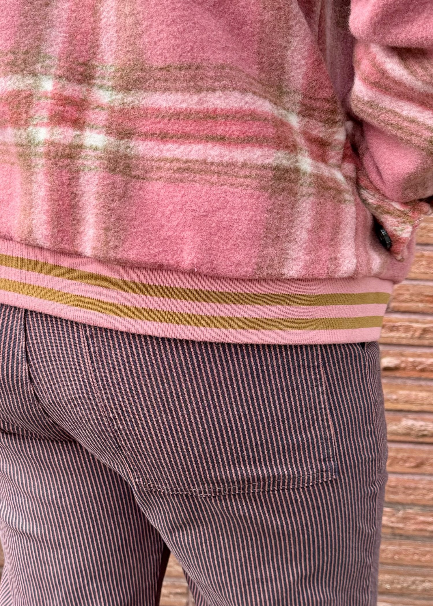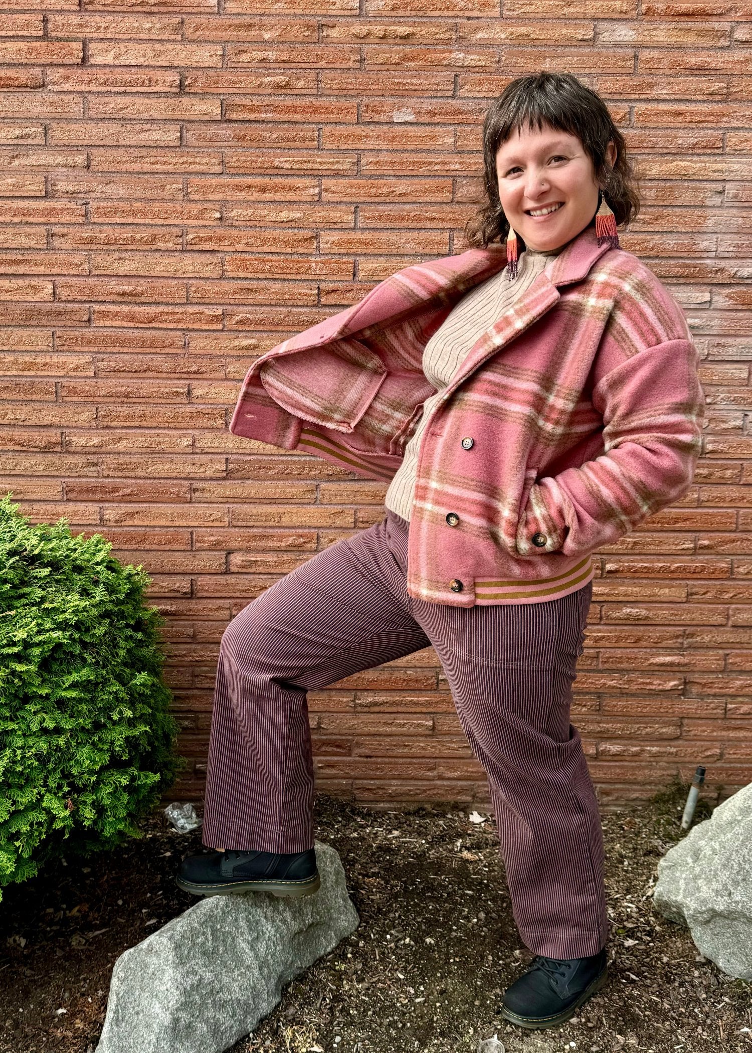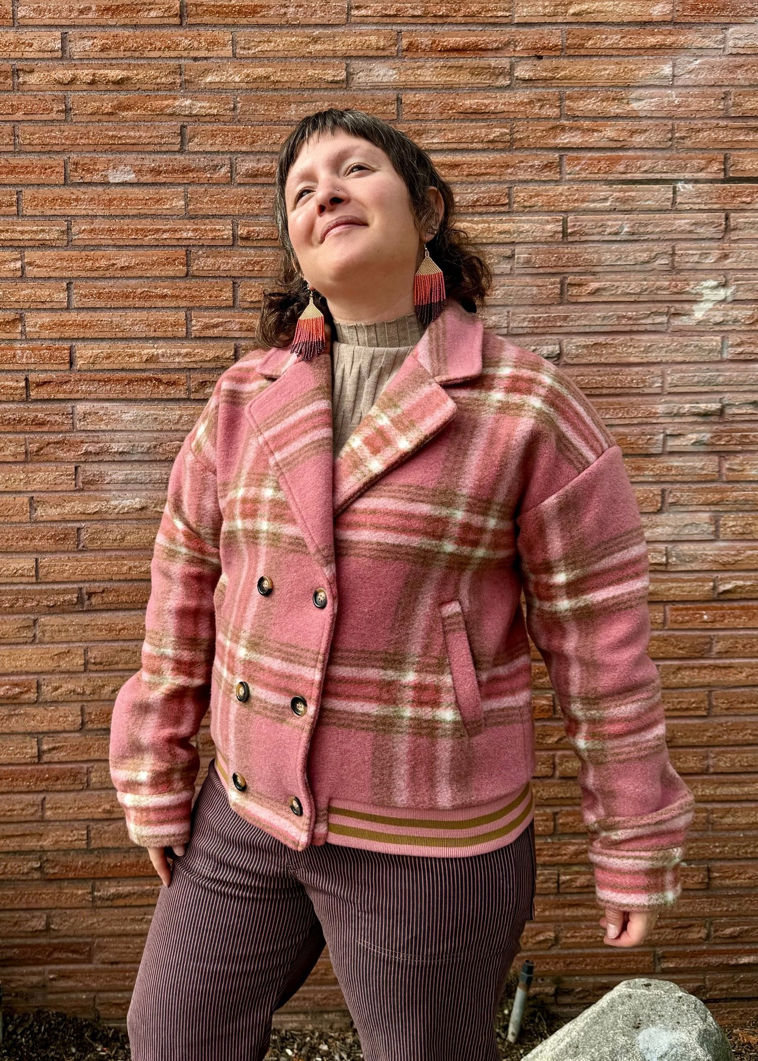 This berry-toned plaid jacket will keep you both warm and looking stylish. It boasts a double-breasted front, side pockets, and a charming striped hem. Embrace the perfect blend of timeless plaid in a classic silhouette with just a smidge of sporty flavor - trust us, it's a must-have! Bonnie is sporting this mega cute coat with the Daza Top and New Smithy Pant.